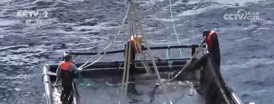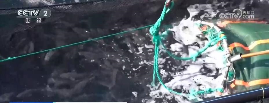 在煙臺長島南隍城海域,隨著經(jīng)海系列深水網(wǎng)箱里魚類的成熟,一場在大海上的收獲正在進行。起降機將一個個裝滿魚兒的巨大網(wǎng)兜轉移到運輸船上,2.5萬尾近4萬斤的成品黑鲪魚,將從這里銷往全國各地。