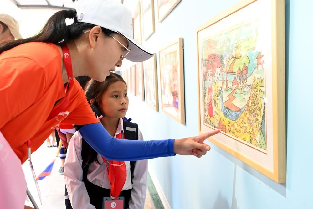 △2023年5月24日,乘坐中老鐵路國(guó)際旅客列車的百名老撾學(xué)生抵達(dá)中國(guó)云南西雙版納,和中國(guó)學(xué)生開(kāi)展聯(lián)誼活動(dòng)。圖為志愿者向老撾學(xué)生講解允景洪小學(xué)內(nèi)展出的學(xué)生畫(huà)作。