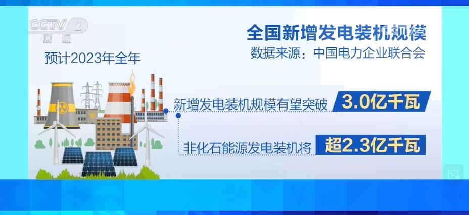 據(jù)預計,2023年全年,全國新增發(fā)電裝機規(guī)模有望突破3.0億千瓦,其中,非化石能源發(fā)電裝機將超過2.3億千瓦。到2023年底,全國發(fā)電裝機容量預計將達到28.6億千瓦,同比增長11.5%左右。其中,并網(wǎng)風電和太陽能發(fā)電合計裝機容量將達到9.6億千瓦,占總裝機的三分之一。