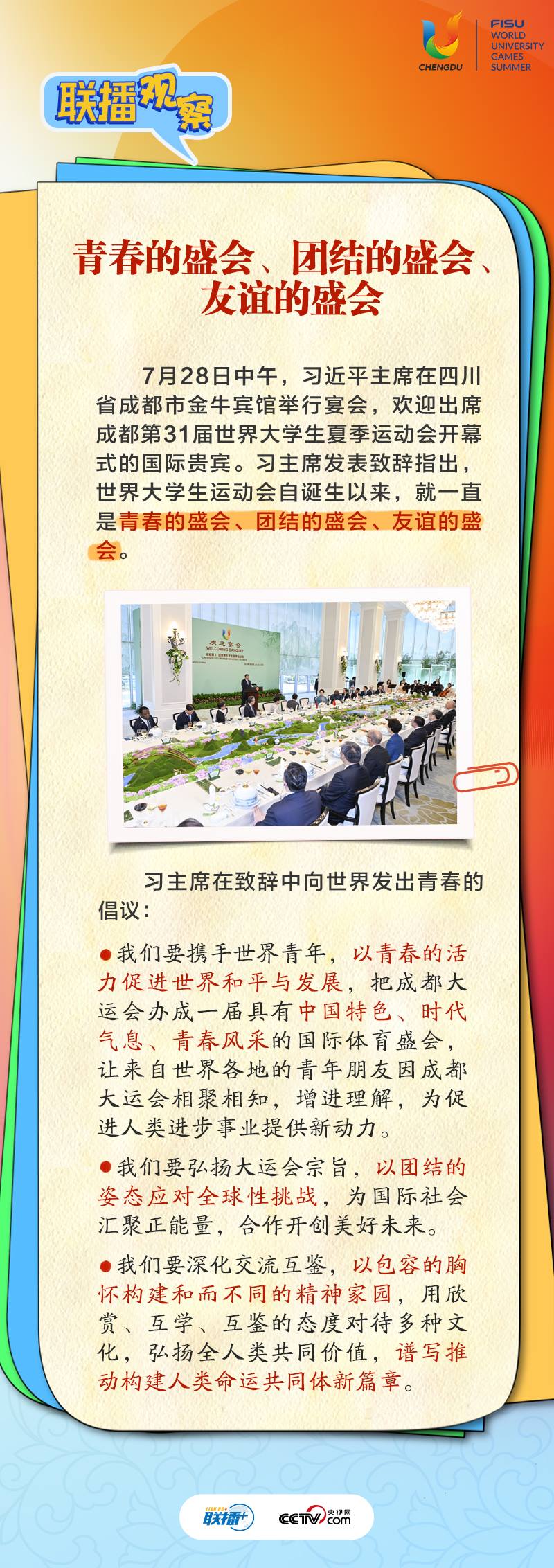 7月28日晚,第31屆世界大學(xué)生夏季運(yùn)動會開幕式在四川省成都市舉行。習(xí)近平主席出席開幕式并宣布本屆大運(yùn)會開幕。
