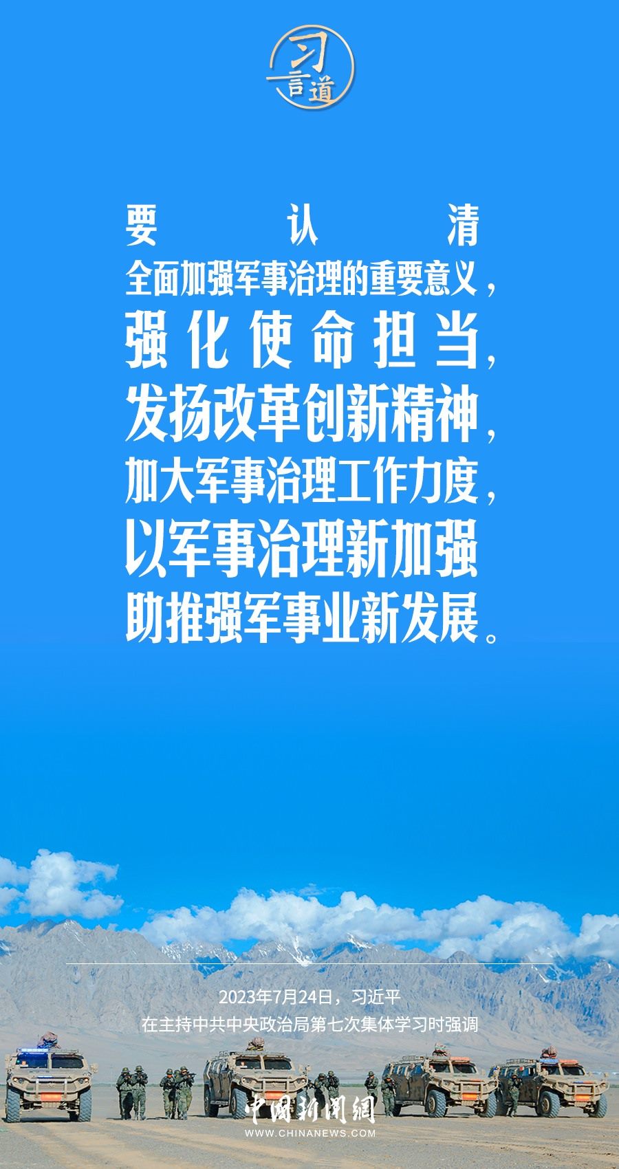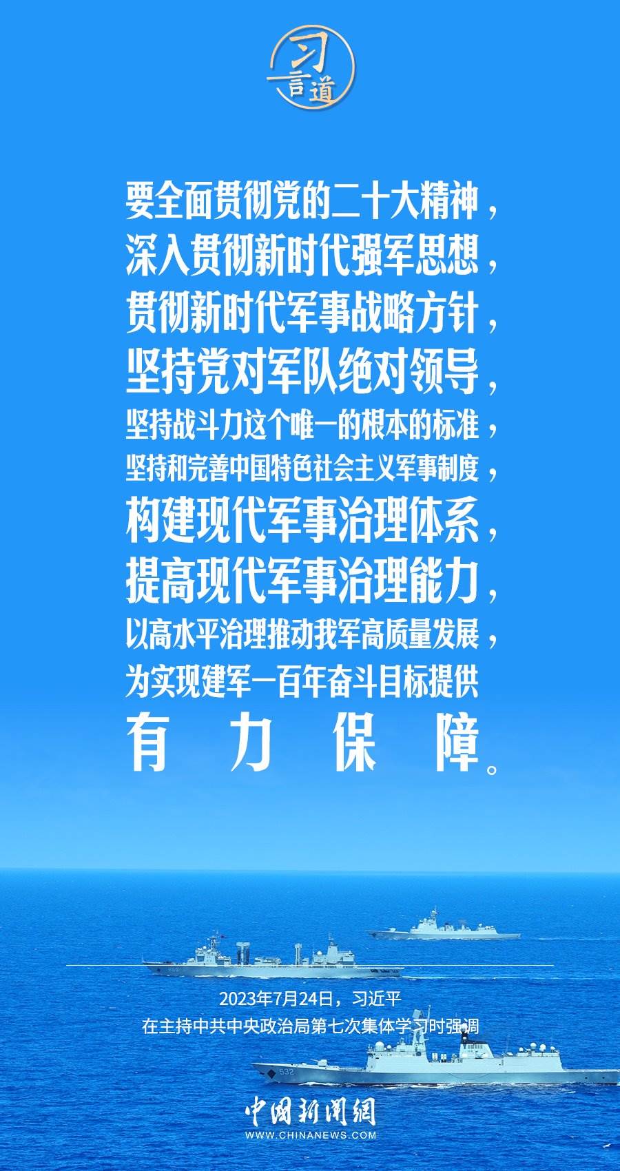 八一建軍節(jié)來(lái)臨之際,中共中央政治局7月24日下午就全面加強(qiáng)軍事治理進(jìn)行第七次集體學(xué)習(xí)。中共中央總書(shū)記習(xí)近平主持學(xué)習(xí),他強(qiáng)調(diào)——