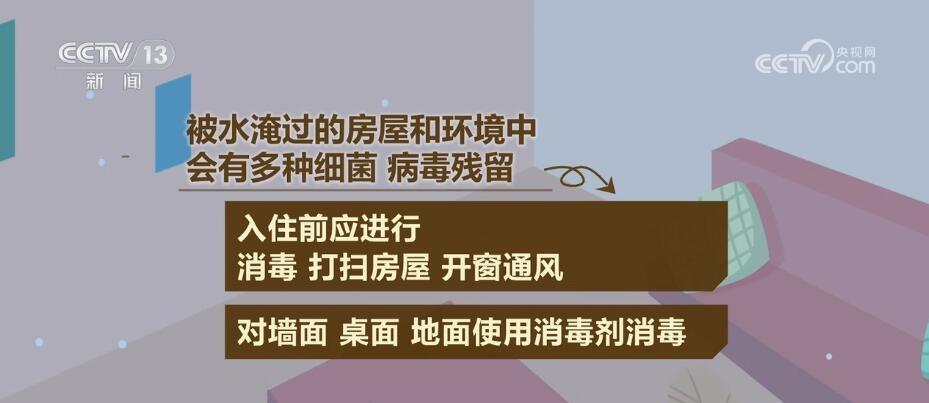 被水淹過(guò)的房屋和環(huán)境中會(huì)有多種細(xì)菌、病毒殘留,入住前應(yīng)進(jìn)行消毒,打掃房屋,開(kāi)窗通風(fēng);對(duì)墻面、桌面、地面使用消毒劑消毒;被水浸泡過(guò)的被褥、衣物等,要先清洗干凈后再曝曬,干透后方可使用;對(duì)于被水淹過(guò)的餐具、茶具等食用器具,要采用煮沸方式進(jìn)行消毒,最好煮沸半小時(shí)以上。