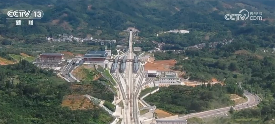 總臺記者 茍順庭:在我身后就是全長12.7公里的貴南高鐵朝陽隧道。因為隧道所在的山體存在有大量的巖溶地質(zhì)點,地下暗河、溶洞溶腔交錯縱橫、環(huán)境復(fù)雜,所以這個朝陽隧道是整條線路上風(fēng)險系數(shù)最高的控制性工程。穿過朝陽隧道后,就到了貴南高鐵貴州段的最后一站——荔波站。