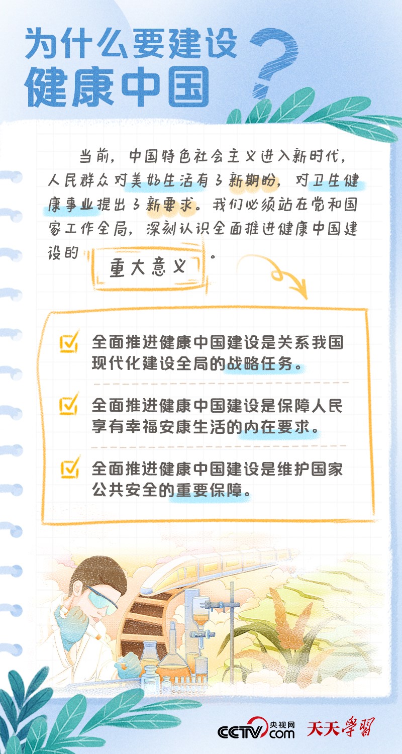 黨的二十大報(bào)告將“建成健康中國(guó)”作為到2035年我國(guó)發(fā)展的總體目標(biāo)之一,并指出,人民健康是民族昌盛和國(guó)家強(qiáng)盛的重要標(biāo)志,把保障人民健康放在優(yōu)先發(fā)展的戰(zhàn)略位置,完善人民健康促進(jìn)政策。什么是健康中國(guó)?如何全面推進(jìn)健康中國(guó)建設(shè)?央視網(wǎng)《天天學(xué)習(xí)·學(xué)習(xí)筆記》特梳理相關(guān)內(nèi)容,為您解讀總書記治國(guó)理政關(guān)鍵詞——健康中國(guó)。