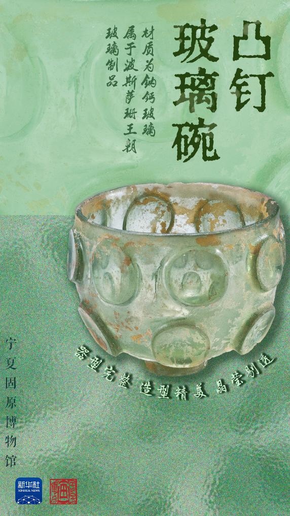 不同于我國(guó)古代的鉛鋇玻璃,這件出土于寧夏固原的凸釘玻璃碗的材質(zhì)是鈉鈣玻璃,是經(jīng)絲綢之路遠(yuǎn)道而來(lái)的“進(jìn)口貨”——波斯薩珊王朝玻璃制品。據(jù)張強(qiáng)介紹,這只玻璃碗體現(xiàn)了薩珊玻璃器形和紋飾上的獨(dú)特風(fēng)格以及精湛的磨琢工藝,是我國(guó)出土的薩珊玻璃器的代表,說(shuō)明當(dāng)時(shí)西方玻璃器經(jīng)絲綢之路輸入中國(guó),也反映出固原作為絲綢之路東段北道的必經(jīng)之地,在當(dāng)時(shí)國(guó)際商業(yè)貿(mào)易和文化傳播中的重要地位。