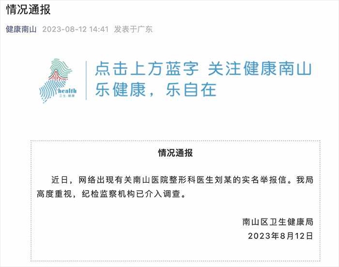·網(wǎng)傳南山醫(yī)院整形科醫(yī)生劉某被實名舉報,官方通報:紀(jì)檢監(jiān)察機(jī)構(gòu)已介入調(diào)查。
