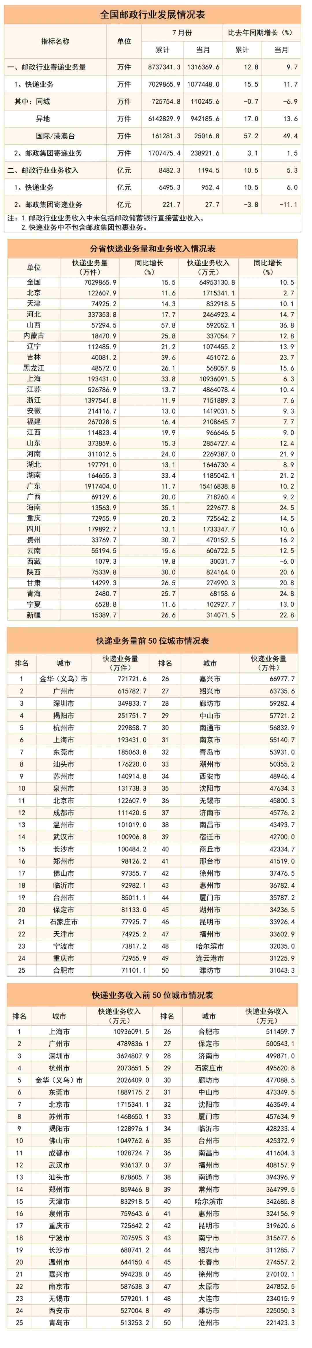 央視網(wǎng)消息:據(jù)國家郵政局消息,1-7月,郵政行業(yè)寄遞業(yè)務(wù)量累計完成873.7億件,同比增長12.8%。其中,快遞業(yè)務(wù)量(不包含郵政集團包裹業(yè)務(wù))累計完成703.0億件,同比增長15.5%。1-7月,同城快遞業(yè)務(wù)量累計完成72.6億件,同比下降0.7%;異地快遞業(yè)務(wù)量累計完成614.3億件,同比增長17.0%;國際/港澳臺快遞業(yè)務(wù)量累計完成16.1億件,同比增長57.2%。
