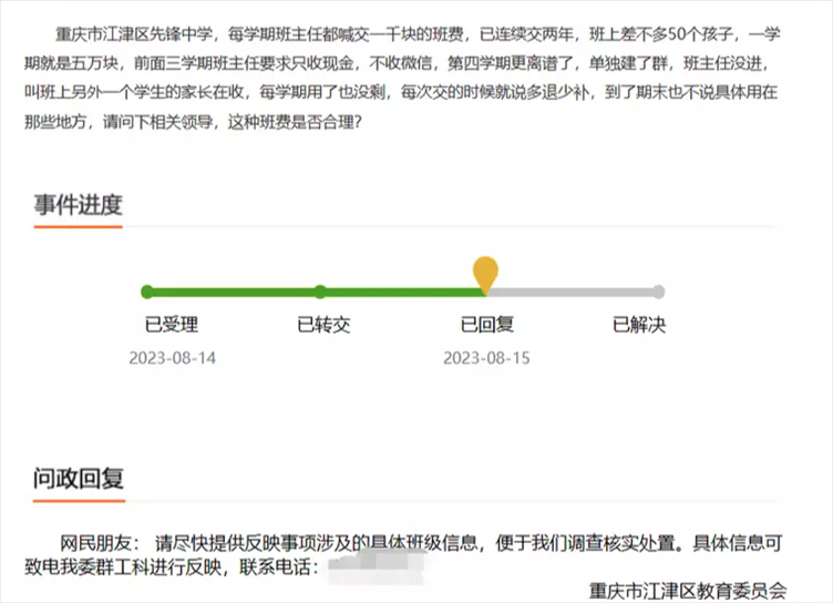 ·重慶江津某中學一班級收5萬元班費,每人一學期交1000元。區(qū)教委:已啟動調查程序,督促學校自查。