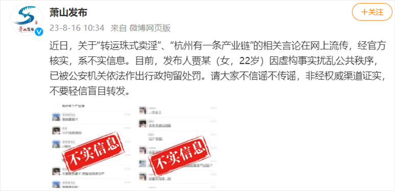 ·杭州蕭山辟謠“轉運珠式賣淫”:發(fā)布人已被行政拘留。