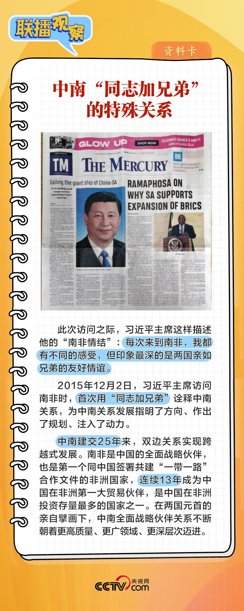 8月22日上午,在同南非總統(tǒng)拉馬福薩舉行會談時,習主席表示:“中南關系之所以好、中南友誼之所以深,關鍵在于兩國兩黨在各自發(fā)展道路上休戚與共,結下了同志加兄弟的深厚友誼?!?/p>