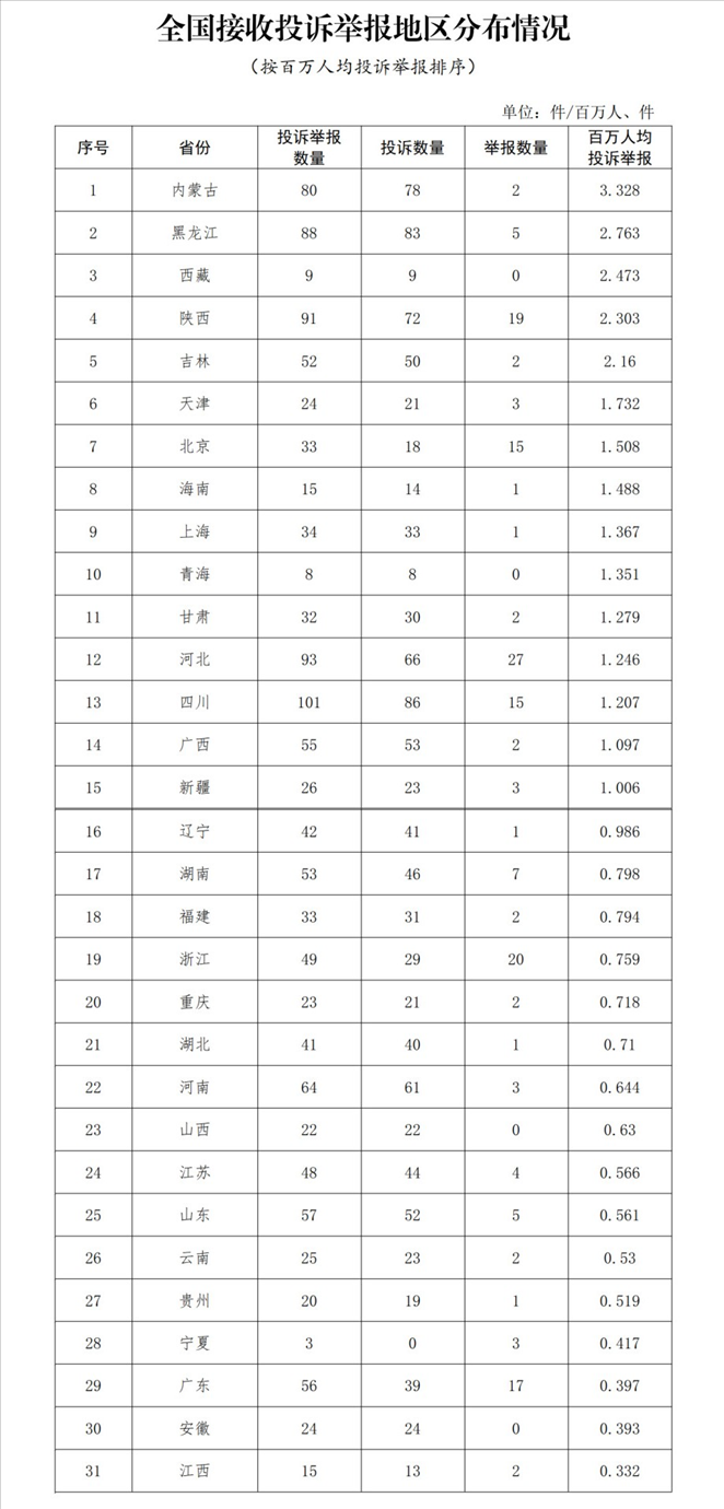 各?。ㄗ灾螀^(qū)、直轄市)按照接收投訴舉報(bào)數(shù)量排序,四川、河北、陜西、黑龍江、內(nèi)蒙古排在全國前5位。其中:按投訴數(shù)量排序,四川、黑龍江、內(nèi)蒙古、陜西、河北排在全國前5位;按舉報(bào)數(shù)量排序,河北、浙江、陜西、廣東、北京(四川并列)排在全國前5位;按百萬人均投訴舉報(bào)數(shù)量排序,內(nèi)蒙古、黑龍江、西藏、陜西、吉林排在全國前5位。(全國接收投訴舉報(bào)地區(qū)分布情況詳見附件1)