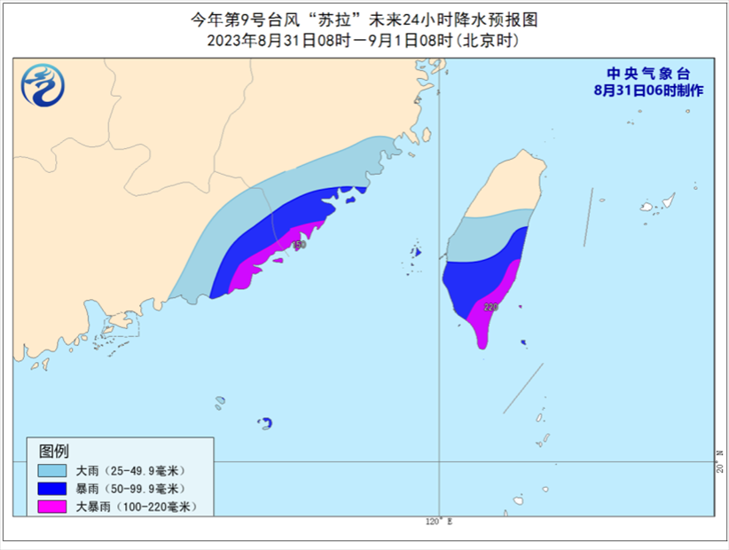 降雨方面,受臺風(fēng)“蘇拉”和南下冷空氣共同影響,8月31日至9月3日,廣東大部、福建中南部、臺灣南部有大到暴雨,廣東中東部、福建東南部有大暴雨、沿海局地特大暴雨。其中,今天白天到夜間,福建東南部、廣東東部、臺灣島中南部的部分地區(qū)有大到暴雨,局地有大暴雨(100-220毫米)。另外,9月2日起受臺風(fēng)“??庇绊懀憬鹊貙⒂休^強降雨。