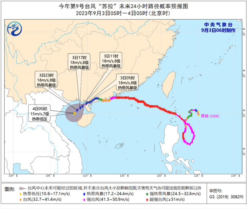 大風預(yù)報:9月3日08時至4日08時,受“蘇拉”影響,北部灣、瓊州海峽以及廣西南部沿海、海南島北部沿海等地將有6-7級大風,其中北部灣部分海域?qū)⒂?級、陣風9-10級的大風;受“??庇绊懀褪亢{、臺灣海峽、臺灣以東洋面、東海南部及釣魚島附近海域以及浙江南部沿海、福建沿海、臺灣島沿海將有6-8級、陣風9-10級大風,部分海域或地區(qū)的風力有9-12級,陣風13-14級,“??敝行慕?jīng)過的附近海面或地區(qū)的風力有13-16級,陣風17級。