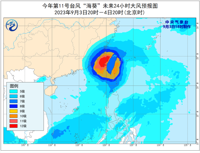 大風(fēng)預(yù)報:9月3日20時至4日20時,巴士海峽、臺灣海峽、臺灣以東洋面、東海南部及釣魚島附近海域、南海東北部以及浙江南部沿海、福建沿海、廣東東部偏東地區(qū)沿海、臺灣島及沿海將有6-8級、陣風(fēng)9-10級大風(fēng),部分海域或地區(qū)的風(fēng)力有9-12級,陣風(fēng)13-14級,“海葵”中心經(jīng)過的附近海面或地區(qū)的風(fēng)力有13-14級,陣風(fēng)15級。