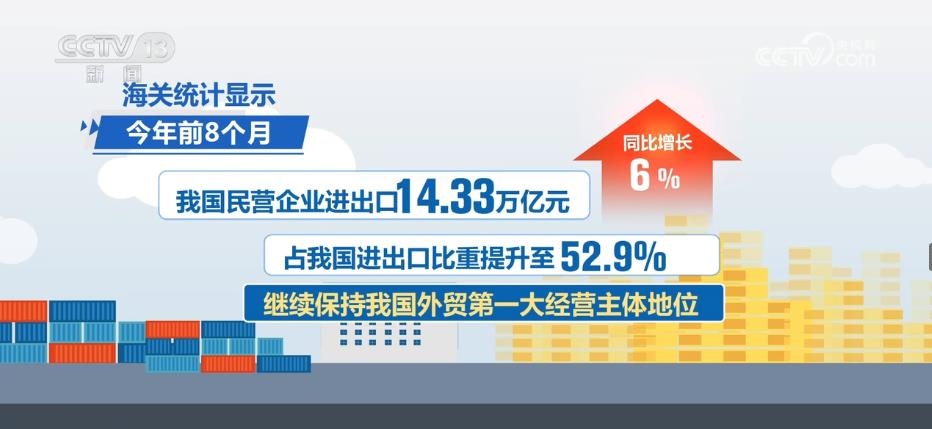 海關(guān)統(tǒng)計顯示,2023年前8個月,我國民營企業(yè)進(jìn)出口14.33萬億元,同比增長6%,占我國進(jìn)出口比重提升至52.9%,繼續(xù)保持我國外貿(mào)第一大經(jīng)營主體地位。