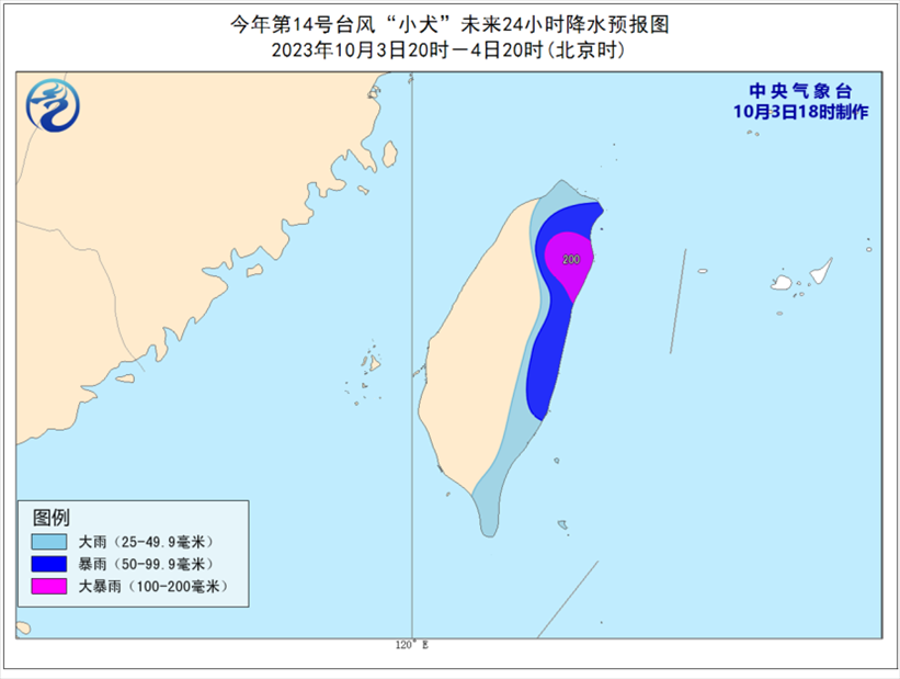 降水預報:3日20時至4日20時,臺灣島東部有大到暴雨,局地有大暴雨(100-200毫米)。
