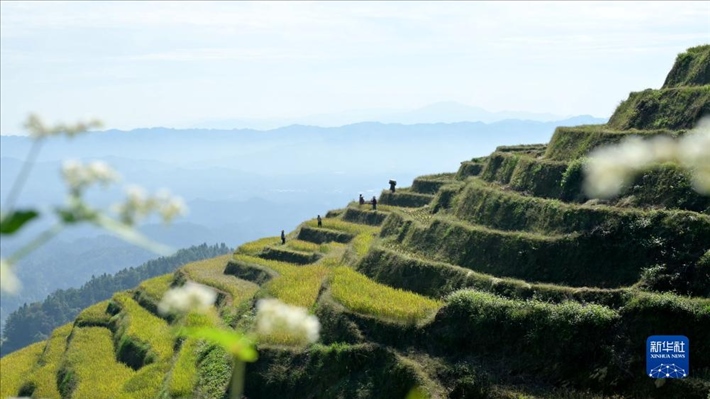 在湖南省婁底市新化縣水車鎮(zhèn)紫鵲界梯田,農(nóng)民采用人工方式收獲稻谷。