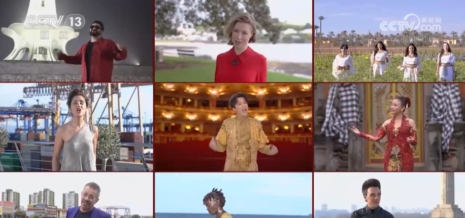 在中國的春節(jié)聯(lián)歡晚會上,來自9個共建“一帶一路”國家的表演者云端相聚,和著中國藝術家的伴奏共唱《一帶繁花一路歌》。