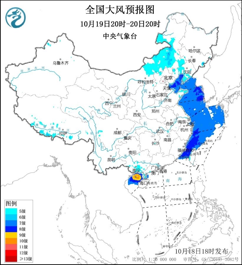 10月19日20時至20日20時,南海西北部海域、北部灣、瓊州海峽將有6~8級、陣風9級的大風,其中北部灣的部分海域風力可達9~10級,陣風11~12級。渤海、渤海海峽、黃海大部海域、東海大部海域、臺灣海峽將有7~8級、陣風9級的大風。內(nèi)蒙古中東部、遼寧南部和西部、廣西南部沿海等地將有5~6級、陣風7~8級的大風。