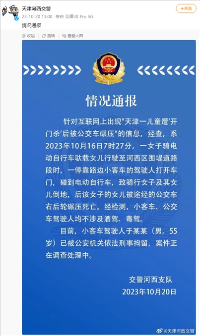 ·天津警方通報“兒童遭開門殺后被公交碾壓死亡”:小客車駕駛?cè)艘驯恍淌戮辛簦讣谡{(diào)查處理中。