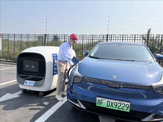 ?2023年10月17日,國網(wǎng)浙江電力工作人員在烏鎮(zhèn)使用首臺智能移動充電機器人為新能源汽車充電。新華網(wǎng)發(fā) 沈佳煒 攝