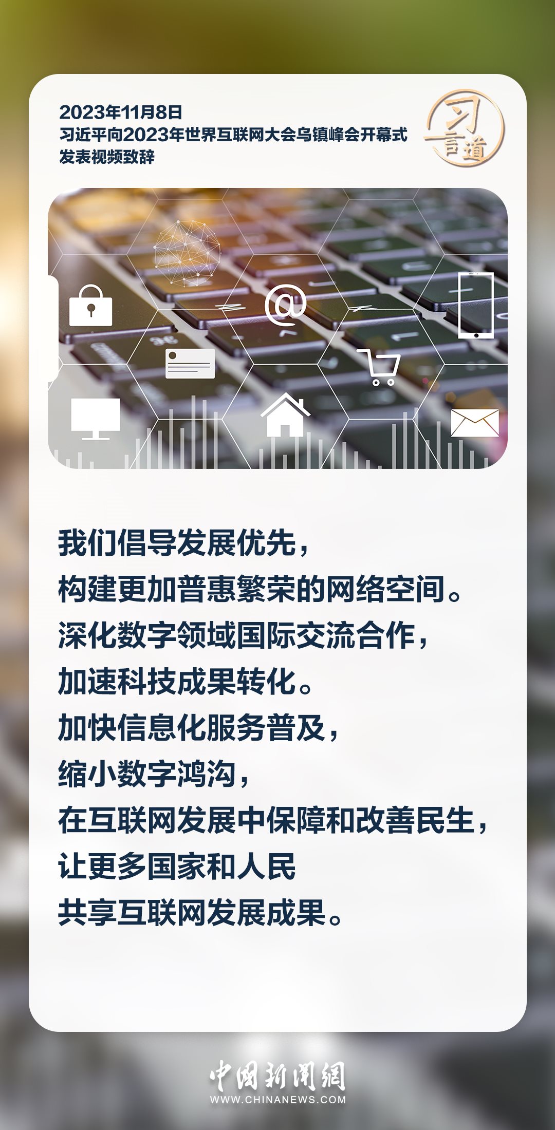 11月8日上午,國家主席習(xí)近平向2023年世界互聯(lián)網(wǎng)大會(huì)烏鎮(zhèn)峰會(huì)開幕式發(fā)表視頻致辭。習(xí)近平指出——