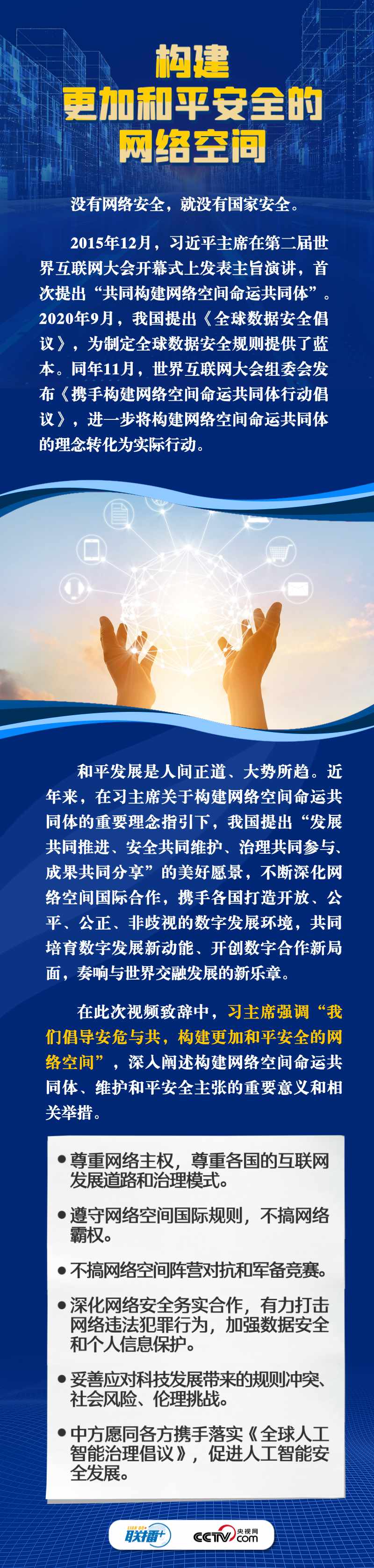 面對新的時代課題,習(xí)主席在此次視頻致辭中倡導(dǎo)構(gòu)建更加普惠繁榮、更加和平安全、更加平等包容的網(wǎng)絡(luò)空間。這三個“網(wǎng)絡(luò)空間”具體內(nèi)容是什么?構(gòu)建網(wǎng)絡(luò)“新空間”有什么具體措施?央視網(wǎng)《聯(lián)播+》與您一同學(xué)習(xí)。