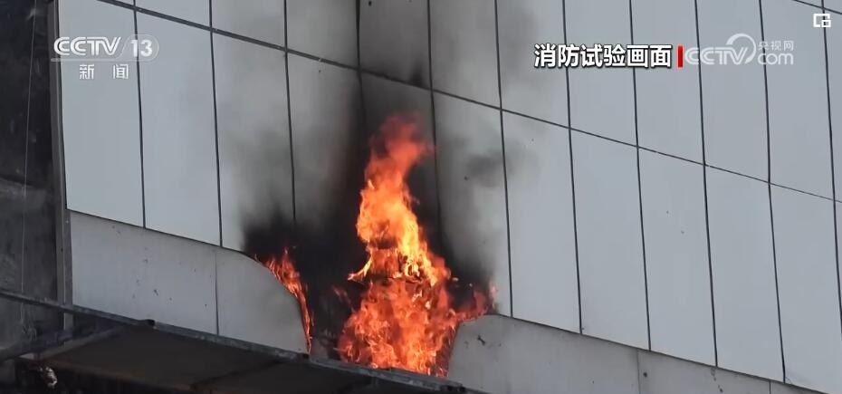 為了真實(shí)模擬高層保溫層火災(zāi)特性,消防滅火無人機(jī)噴射一分鐘高壓液體后就停止作業(yè)。此時(shí),過火鋁塑板周邊縫隙還不斷有黑煙冒出,大約2分鐘后,這些鋁塑板的縫隙里開始出現(xiàn)明火,這就意味著鋁塑板下層的保溫層泡沫出現(xiàn)了復(fù)燃,與此同時(shí),滴落在下方平臺(tái)上的泡沫殘?jiān)查_始復(fù)燃。5分鐘后,表層的鋁塑板被燒開,露出保溫層的熊熊火焰,同時(shí)與底部復(fù)燃的火焰上下貫通,外墻裝飾材料開始更為猛烈的燃燒,大量的裝飾材料被點(diǎn)燃,直接砸向地面或者四處飄落,火災(zāi)有進(jìn)一步擴(kuò)大的風(fēng)險(xiǎn)。