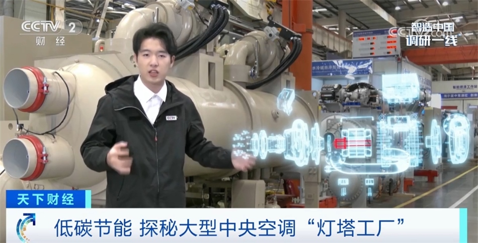 總臺(tái)央視記者 吳柏辰:今天我們來(lái)到的是位于山東青島的一家生產(chǎn)中央空調(diào)的“燈塔工廠(chǎng)”,這里生產(chǎn)的空調(diào)跟我們平時(shí)家用的不一樣,我身邊這樣的大家伙就是一臺(tái)商用中央空調(diào)的主機(jī)。要知道一棟寫(xiě)字樓或者商場(chǎng),空調(diào)制冷和制熱的能耗往往能能夠占到整體能耗的60%以上。這種大型空調(diào)如何用最少的電獲得最大的制冷或制熱效果?關(guān)鍵就在于空調(diào)主機(jī)的壓縮機(jī),我們可以看到在這臺(tái)空調(diào)頂端的這個(gè)白色裝置氣懸浮壓縮機(jī),它采用的就是一種空氣動(dòng)力學(xué)技術(shù)。就像我們熟知的飛機(jī)機(jī)翼通過(guò)上下空氣流動(dòng)的速度不同所產(chǎn)生的浮力,它就運(yùn)用了同樣的原理。