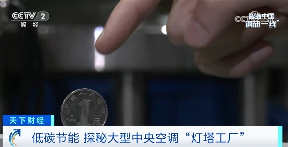 我現(xiàn)在走進(jìn)的這個(gè)區(qū)域是空調(diào)產(chǎn)線(xiàn)的末端——檢測(cè)平臺(tái)。每一臺(tái)空調(diào)出廠(chǎng)前都要在這里經(jīng)過(guò)全方位的檢測(cè)。眼前這就是一臺(tái)正在運(yùn)轉(zhuǎn)的氣懸浮中央空調(diào),我們?cè)诳照{(diào)上立了一枚硬幣,可以看到是紋絲不動(dòng)的,這也是氣懸浮的特點(diǎn)之一——運(yùn)行比較平穩(wěn)。在這塊屏幕上顯示著空調(diào)的出水溫度7℃,恒定的出水溫度讓這臺(tái)空調(diào)產(chǎn)生的冷風(fēng)非常柔和。目前,這座工廠(chǎng)全流程的自動(dòng)化生產(chǎn)能夠滿(mǎn)足從小型商用空調(diào)生產(chǎn)到用戶(hù)需求的大規(guī)模定制。目前低能耗、智能化產(chǎn)品已應(yīng)用在商業(yè)地產(chǎn)、酒店、軌道交通等各種場(chǎng)景,極大程度助力著國(guó)家“雙碳”政策以及各大行業(yè)的低碳轉(zhuǎn)型。