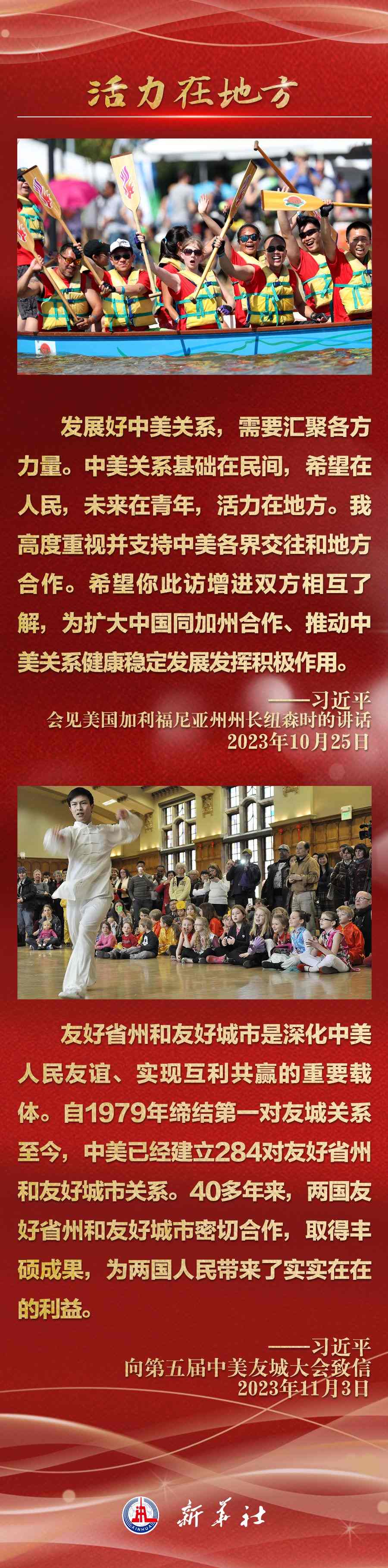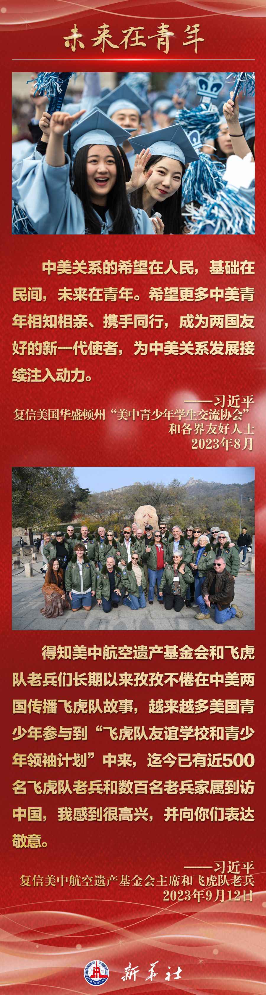 今年以來,從在京會見美國各界人士,到向“鼓嶺緣”中美民間友好論壇等活動致賀信,再到復(fù)信美國華盛頓州“美中青少年學(xué)生交流協(xié)會”、史迪威將軍后人、飛虎隊(duì)老兵等友好人士,習(xí)近平主席同美國各界真摯互動,強(qiáng)調(diào)中美關(guān)系基礎(chǔ)在民間,希望在人民,未來在青年,活力在地方。