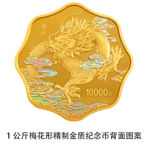 1公斤梅花形金質(zhì)紀(jì)念幣背面圖案為龍?jiān)煨?,襯以祥云組合設(shè)計(jì)。
