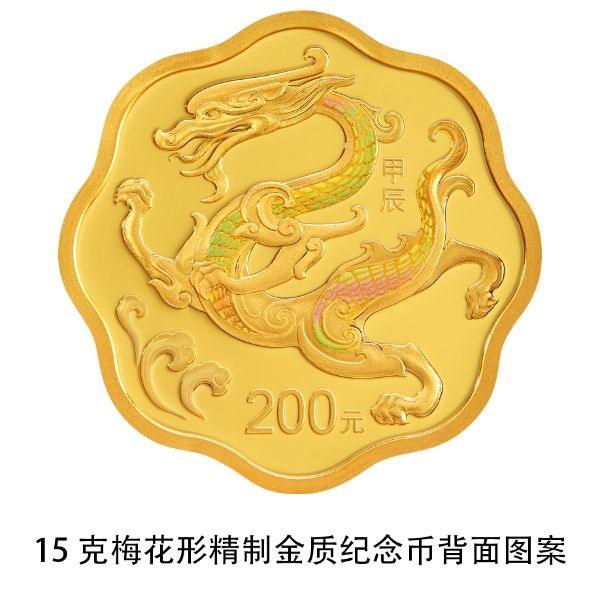 15克梅花形金質(zhì)紀(jì)念幣背面圖案為龍?jiān)煨?,襯以浪花組合設(shè)計(jì)。