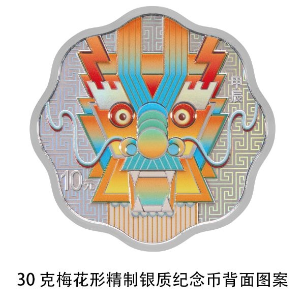 30克梅花形銀質(zhì)紀(jì)念幣背面圖案為裝飾龍?jiān)煨?,襯以回紋紋飾。