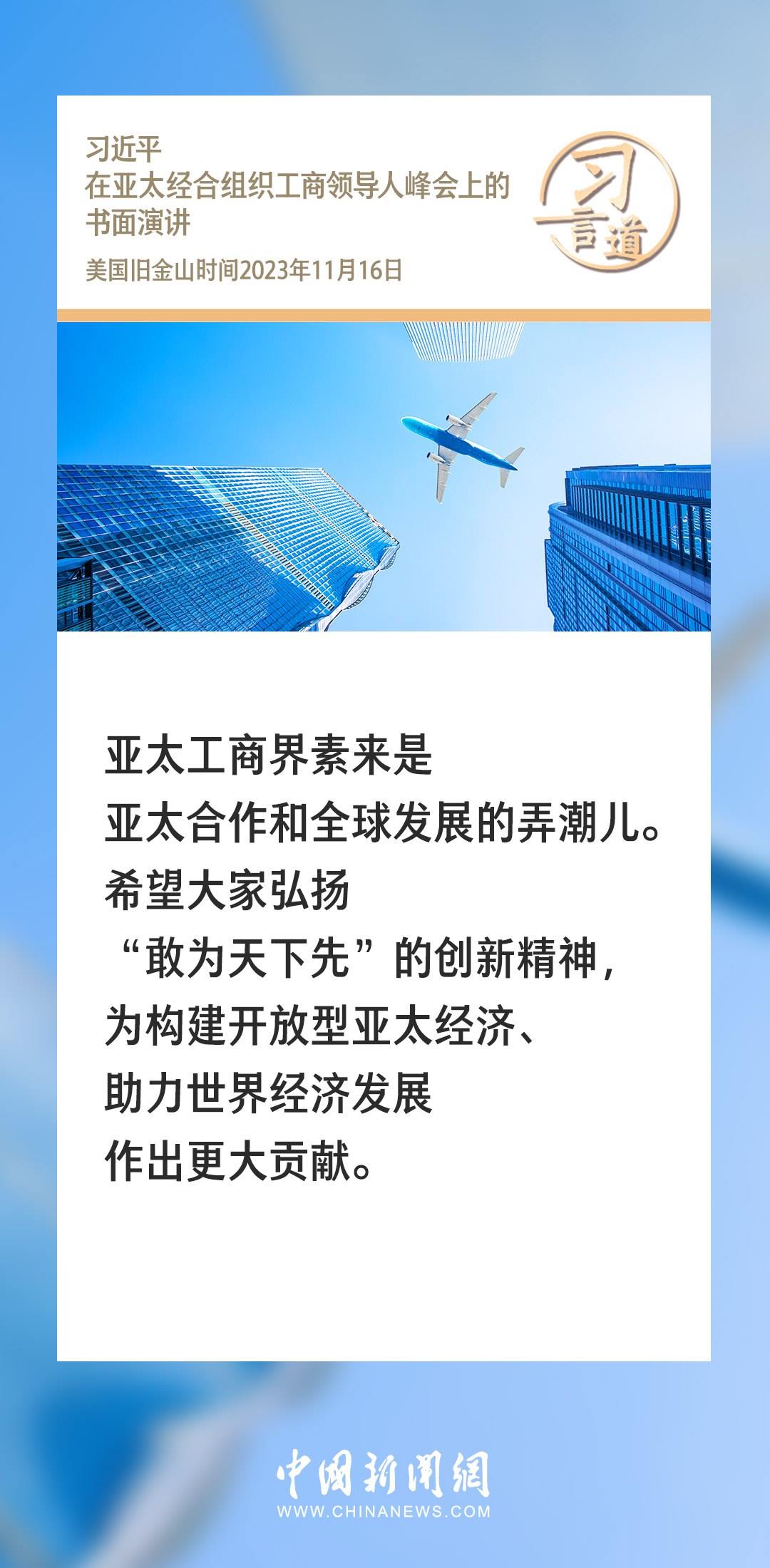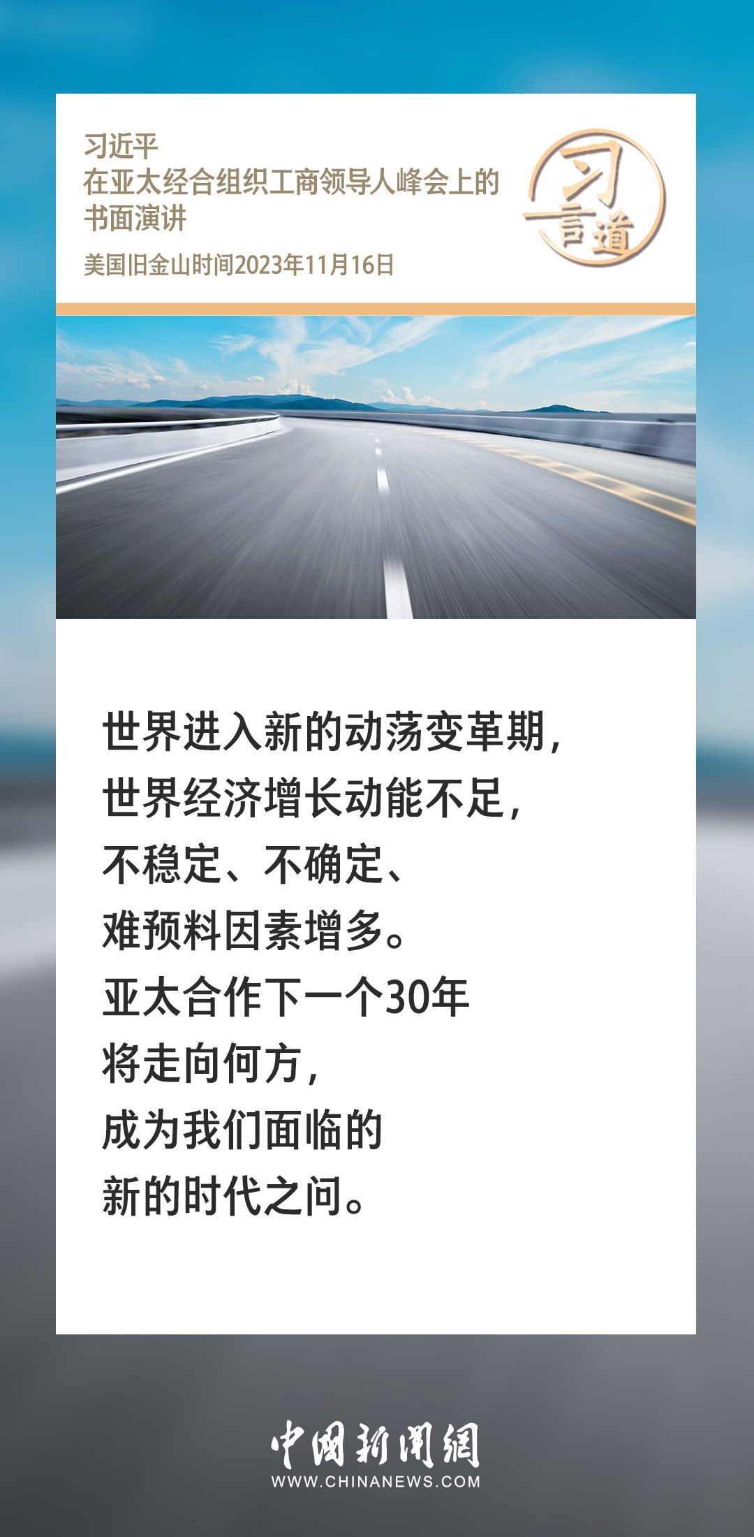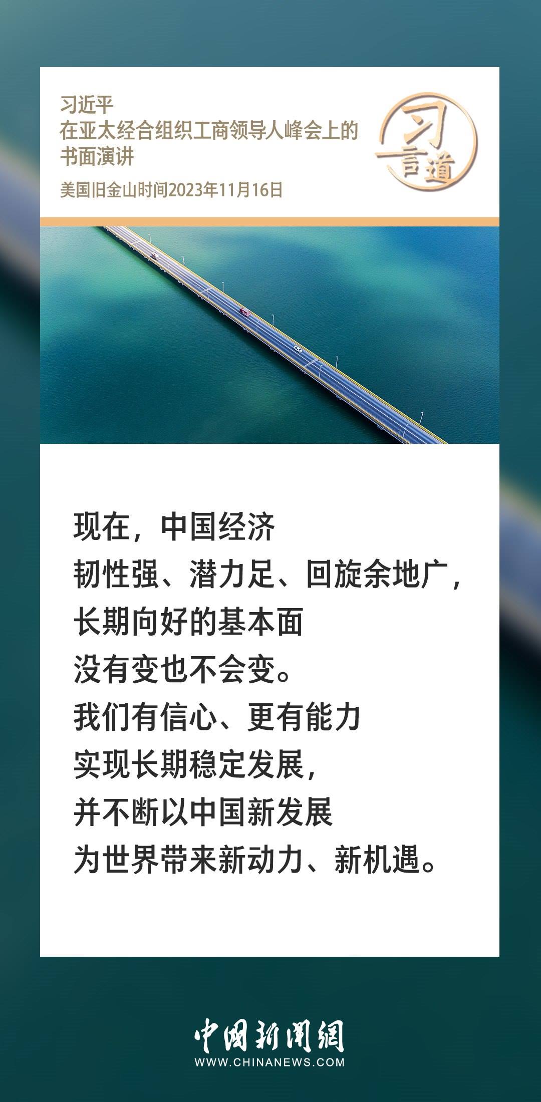 當地時間11月16日上午,國家主席習近平向在舊金山舉行的亞太經合組織工商領導人峰會發(fā)表題為《同心協(xié)力 共迎挑戰(zhàn) 譜寫亞太合作新篇章》的書面演講。習近平指出——
