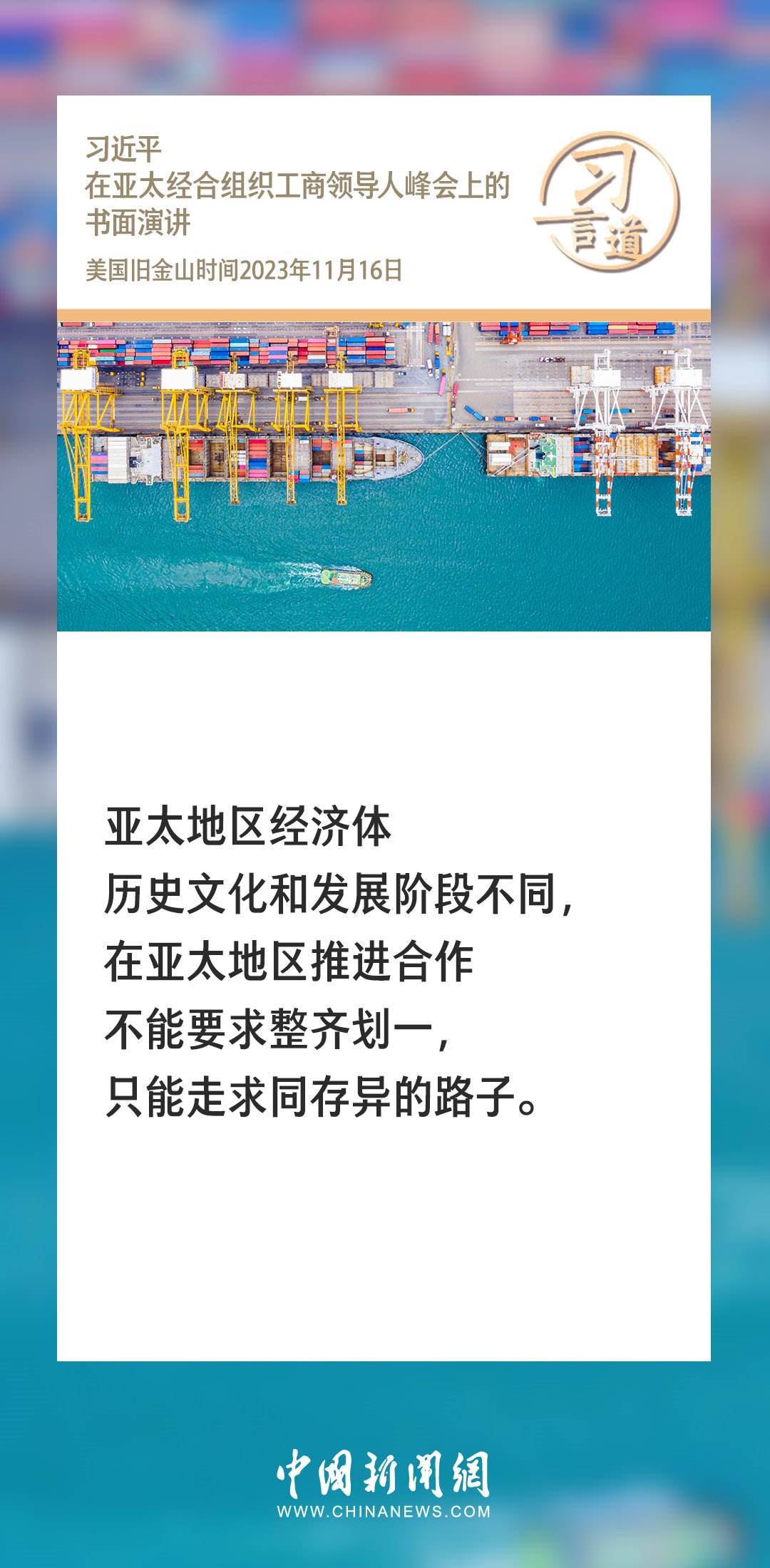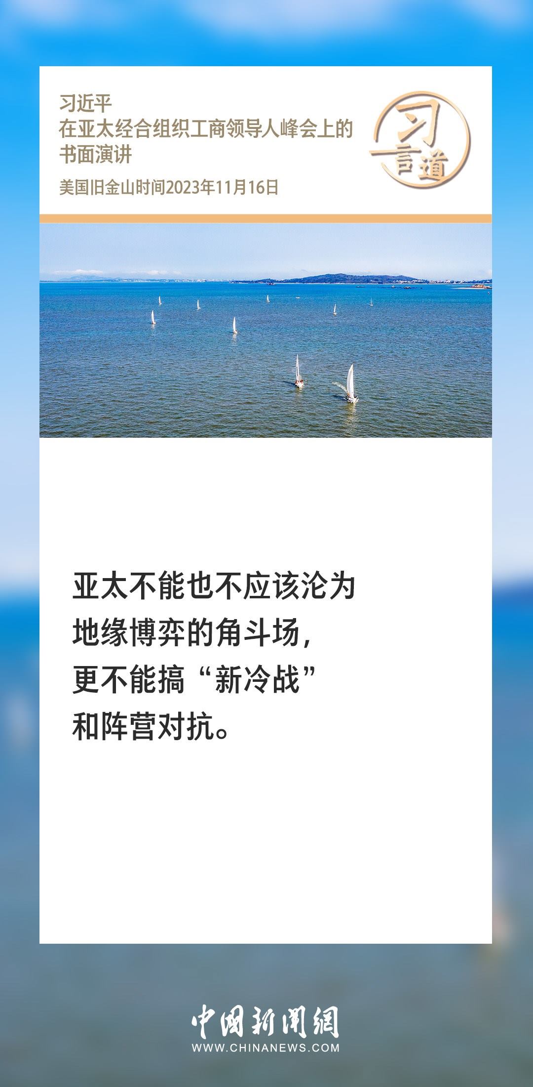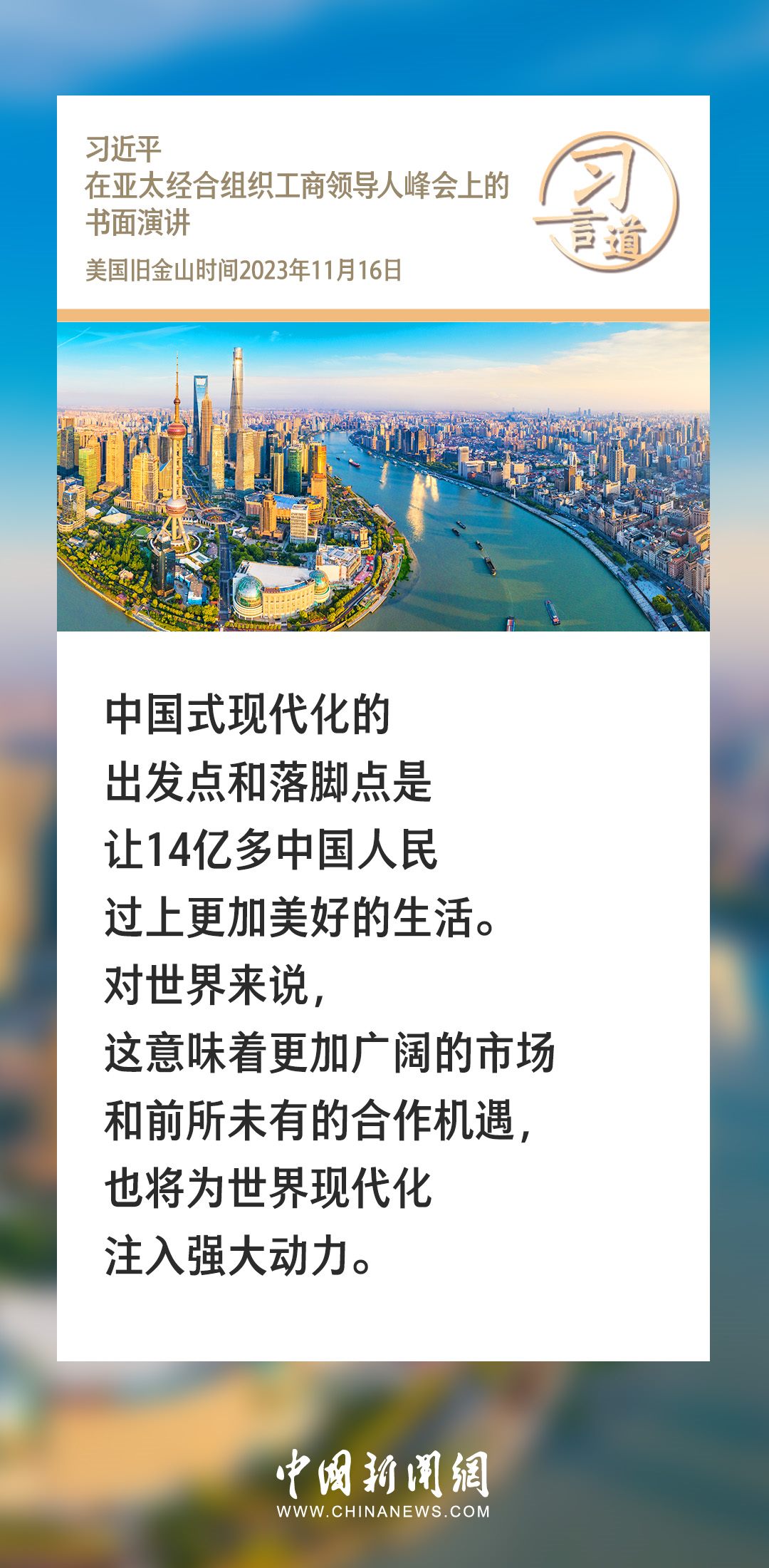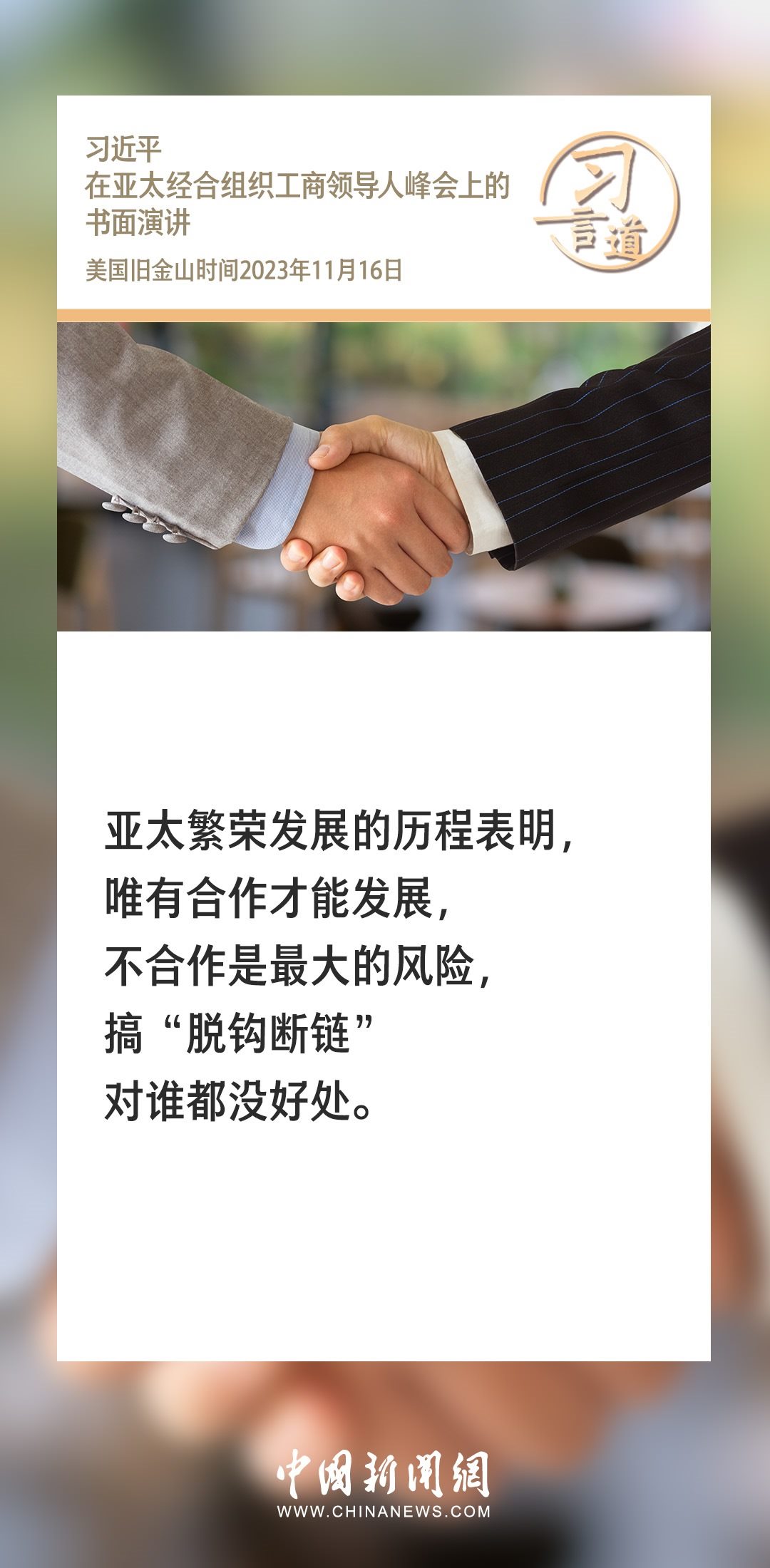 當地時間11月16日上午,國家主席習近平向在舊金山舉行的亞太經合組織工商領導人峰會發(fā)表題為《同心協(xié)力 共迎挑戰(zhàn) 譜寫亞太合作新篇章》的書面演講。習近平指出——