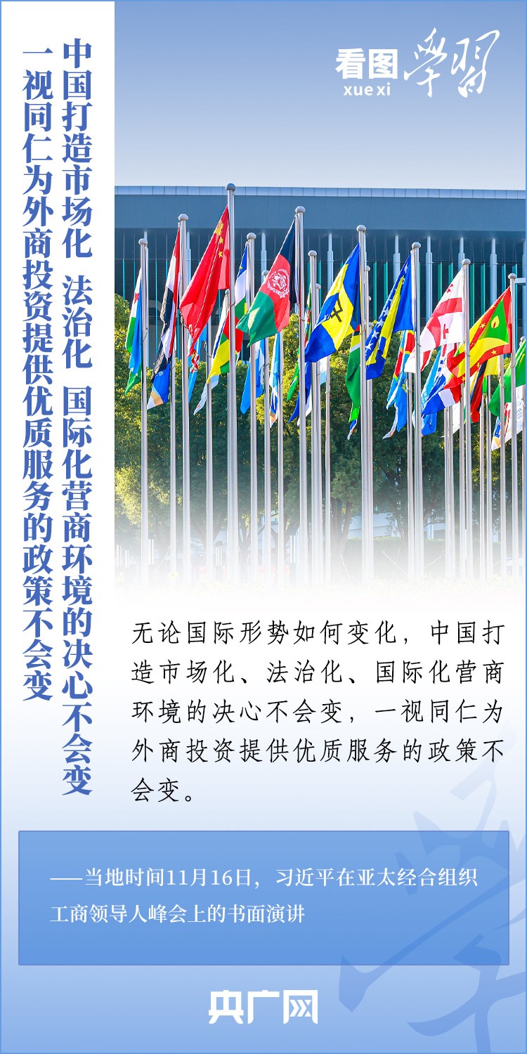 當(dāng)?shù)貢r間11月16日,國家主席習(xí)近平應(yīng)邀出席亞太經(jīng)合組織工商領(lǐng)導(dǎo)人峰會并發(fā)表書面演講。習(xí)主席深刻總結(jié)了亞太經(jīng)濟合作30年來非凡成就和啟示,對亞太合作下一個30年將走向何方這一新的時代之問提出中國答案,重申“中國打造市場化、法治化、國際化營商環(huán)境的決心不會變,一視同仁為外商投資提供優(yōu)質(zhì)服務(wù)的政策不會變”,向全球工商界發(fā)出邀請,歡迎“積極參與中國式現(xiàn)代化進程,共享中國高質(zhì)量發(fā)展帶來的巨大機遇!”一起來學(xué)習(xí)。
