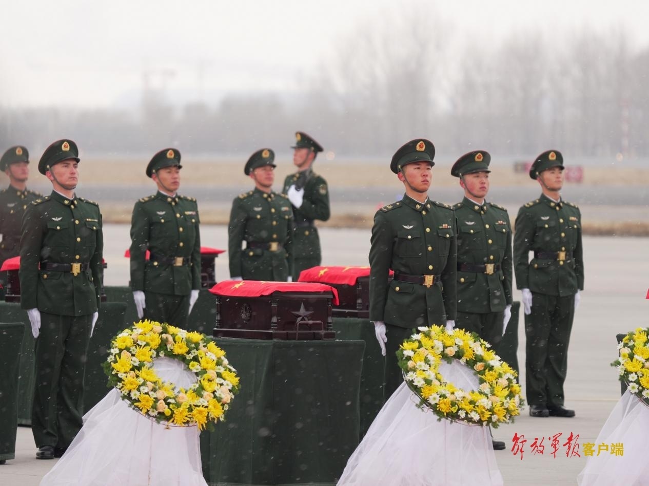 雪花飛舞間,《義勇軍進行曲》的鏗鏘旋律響起。擔負此次司禮演奏任務的武警北京總隊軍樂團已是第六次接志愿軍烈士回家??粗\-20專機緩慢降落,演奏員吳鐘又一次感受到肩上所背負的使命——作為英雄踏上故土聽到的第一首樂曲,這是國的召喚,更是家的慰藉。