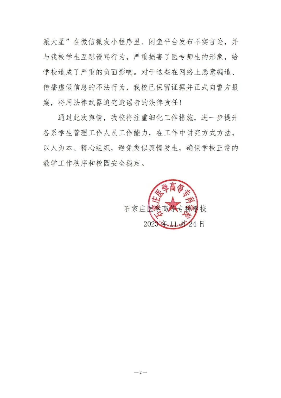 央視網(wǎng)消息:近日,網(wǎng)傳石家莊醫(yī)學高等??茖W校檢查學生宿舍,并將沒收來的物品掛在二手平臺咸魚上出售,事件引發(fā)關(guān)注。11月24日,石家莊醫(yī)學高等??茖W校發(fā)布聲明稱,22日學校利用學生在宿舍時間,排查大功率違規(guī)電器。查獲違規(guī)電器分別由各系登記造表、統(tǒng)一保管,定于放寒假時返還學生帶回家。經(jīng)核實,網(wǎng)傳短視頻實為學生準備去實習一起收拾房間物品時的視頻,被別有用心人員移花接木、惡意引用。此外,網(wǎng)名為“林北我叫派大星”在微信狐友小程序里、閑魚平臺發(fā)布不實言論,并與學校學生互懟謾罵行為,嚴重損害了醫(yī)專師生的形象,給學校造成了嚴重的負面影響。學校已保留證據(jù)并正式向警方報案。