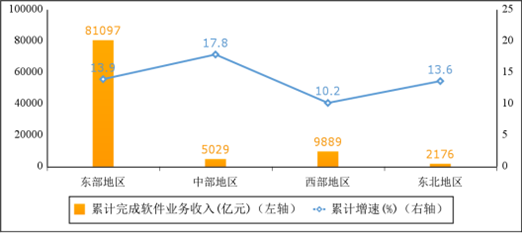 西部地區(qū)軟件業(yè)務(wù)收入小幅提升,中部地區(qū)增勢(shì)突出。1—10月份,東部地區(qū)完成軟件業(yè)務(wù)收入81097億元,同比增長(zhǎng)13.9%,增速較前三季度回落0.2個(gè)百分點(diǎn);中部地區(qū)完成軟件業(yè)務(wù)收入5029億元,同比增長(zhǎng)17.8%,增速較前三季度提高5.7個(gè)百分點(diǎn);西部地區(qū)完成軟件業(yè)務(wù)收入9889億元,同比增長(zhǎng)10.2%,增速較前三季度提高0.3個(gè)百分點(diǎn);東北地區(qū)完成軟件業(yè)務(wù)收入2176億元,同比增長(zhǎng)13.6%,增速與前三季度持平。四個(gè)地區(qū)軟件業(yè)務(wù)收入在全國(guó)總收入中的占比分別為82.6%、5.1%、10.1%和2.2%。