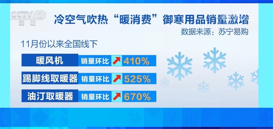 ?????? 數(shù)據(jù)顯示,11月份以來,某家電賣場全國線下暖風(fēng)機銷量環(huán)比增長410%,踢腳線取暖器銷量環(huán)比增長525%,油汀取暖器銷量環(huán)比增長670%。此外,某電商平臺上,暖鞋器、發(fā)熱圍脖、水暖毯、電暖桌等新型取暖設(shè)備的銷售額環(huán)比增長超過一倍。