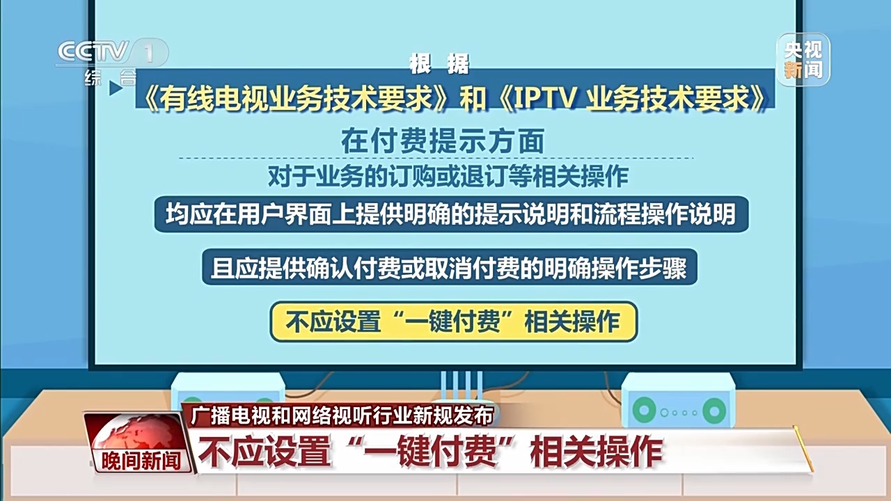 在付費提示方面,對于業(yè)務(wù)的訂購或退訂等相關(guān)操作,均應(yīng)在用戶界面上,提供明確的提示說明和流程操作說明,且應(yīng)提供確認(rèn)付費或取消付費的明確操作步驟,不應(yīng)設(shè)置“一鍵付費”相關(guān)操作。此外,有線電視和IPTV遙控器應(yīng)具備快捷看直播頻道的按鍵,通過此按鍵直接進(jìn)入全屏直播,按鍵名稱應(yīng)為“看電視”。