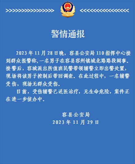 ·廣西容縣警方通報(bào)“男子鬧事致輔警受傷”:已將其帶回調(diào)查,輔警無(wú)生命危險(xiǎn)。