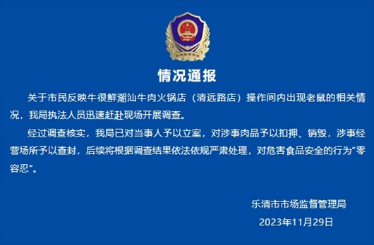 ·溫州樂(lè)清官方通報(bào)火鍋店現(xiàn)老鼠啃牛排:已對(duì)當(dāng)事人予以立案,對(duì)涉事肉品予以扣押、銷(xiāo)毀,涉事經(jīng)營(yíng)場(chǎng)所予以查封。