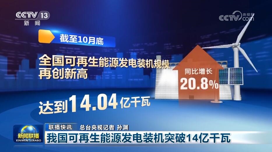 國(guó)家能源局發(fā)布數(shù)據(jù)顯示,截至10月底,全國(guó)可再生能源發(fā)電裝機(jī)規(guī)模再創(chuàng)新高,達(dá)到14.04億千瓦,同比增長(zhǎng)20.8%,約占全國(guó)發(fā)電總裝機(jī)的49.9%。