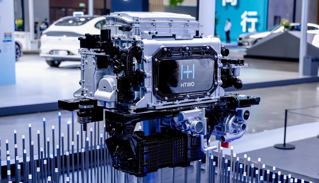 ?在2023世界新能源汽車大會(huì)技術(shù)展區(qū),車企展示的一款氫燃料電池系統(tǒng)。新華社記者夏天 攝