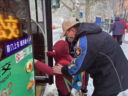 司乘人員護(hù)送小乘客登上北京通學(xué)公交車。(北京公交集團(tuán)供圖)