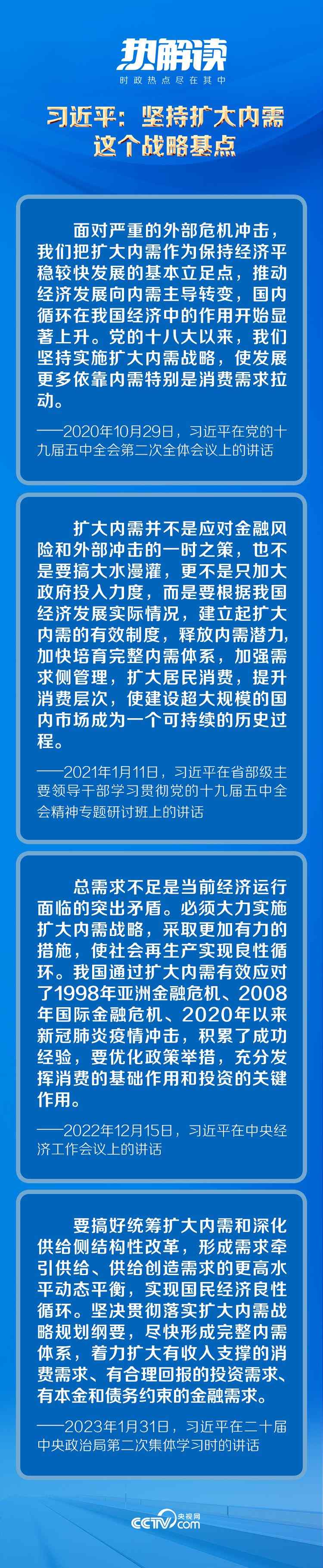 黨的十八大以來,習(xí)近平總書記從我國經(jīng)濟(jì)運(yùn)行的實(shí)際出發(fā),對(duì)擴(kuò)大內(nèi)需作出了一系列重要論述,為實(shí)施擴(kuò)大內(nèi)需戰(zhàn)略提供了科學(xué)指引。