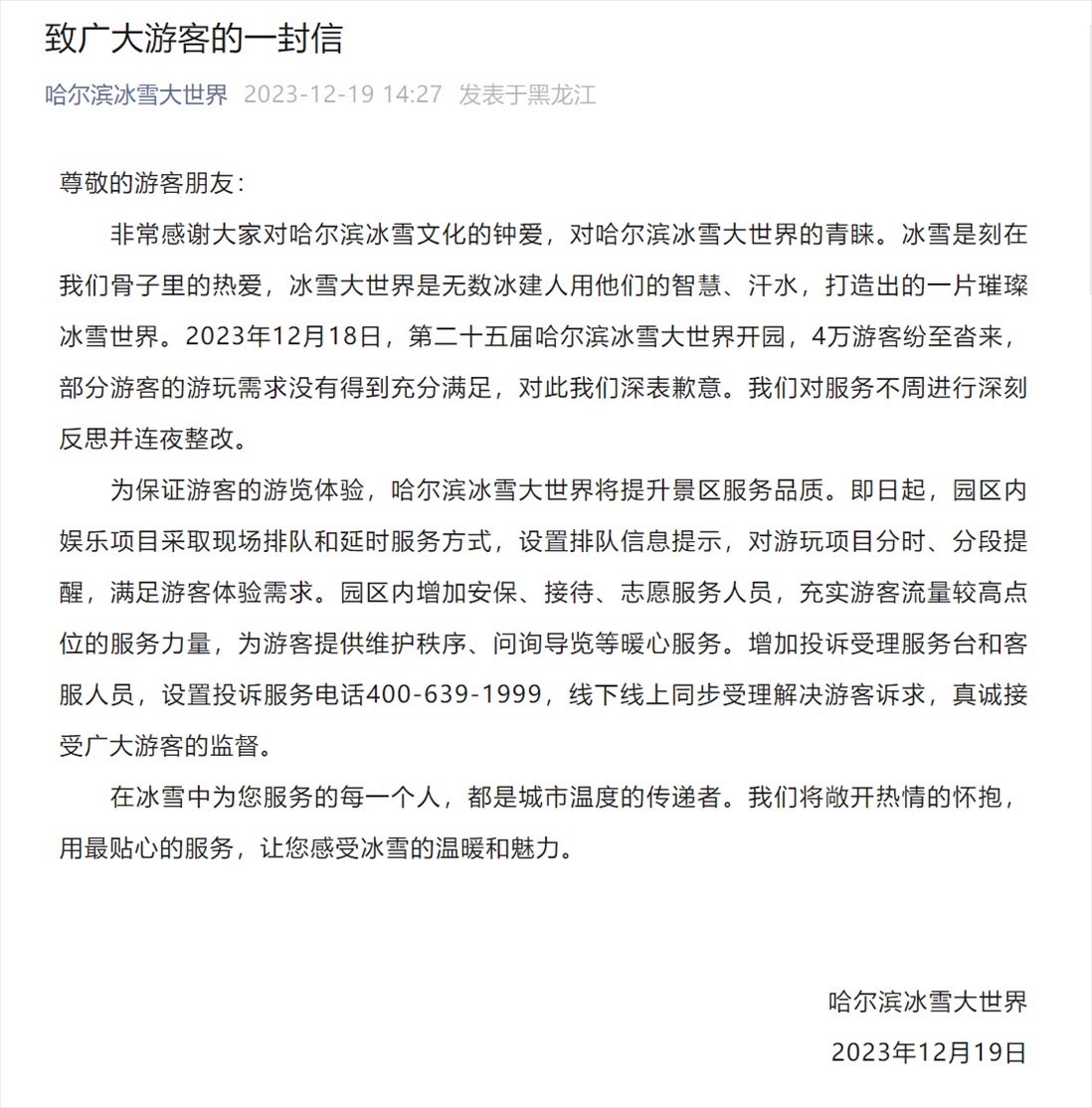 ·哈爾濱冰雪大世界開園首日被喊退票,園區(qū)發(fā)文致歉:連夜整改。當?shù)匚穆镁只貞?yīng)已去現(xiàn)場督導(dǎo)。