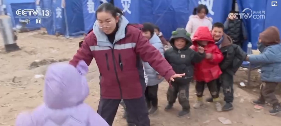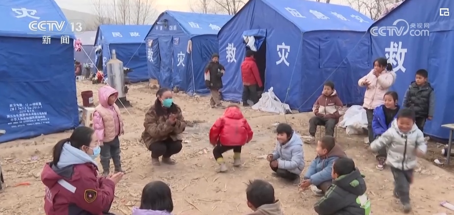 在康吊村三社的臨時安置點(diǎn),來自甘肅省第二人民醫(yī)院的心理治療師李轉(zhuǎn)雄正帶著村里的孩子做游戲。丟手絹、老鷹抓小雞,在一遍又一遍的追逐當(dāng)中,孩子們的笑聲越來越響亮。